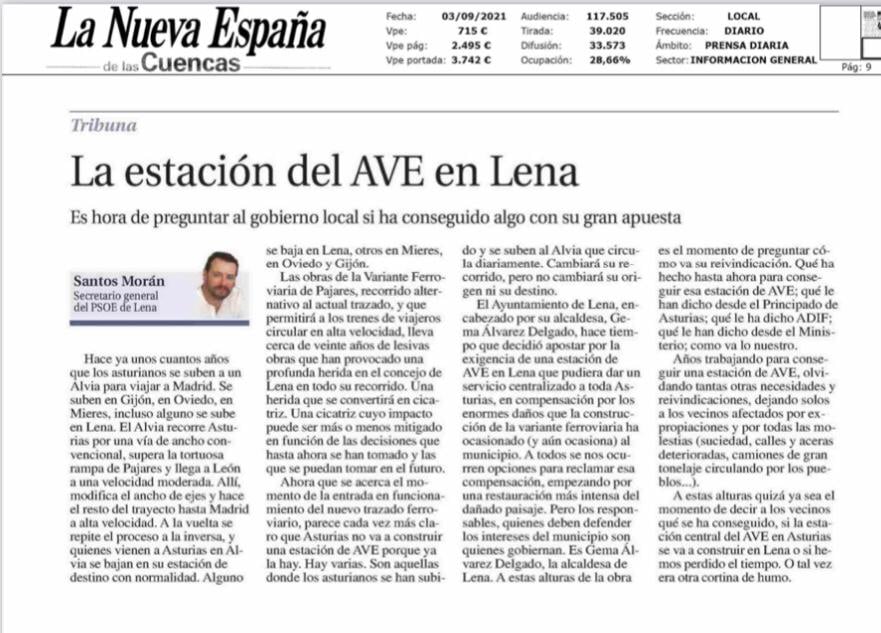Es el momento de decir a los vecinos qué se ha conseguido, si la estación central del AVE en Asturias se va a construir en Lena o si hemos perdido el tiempo.